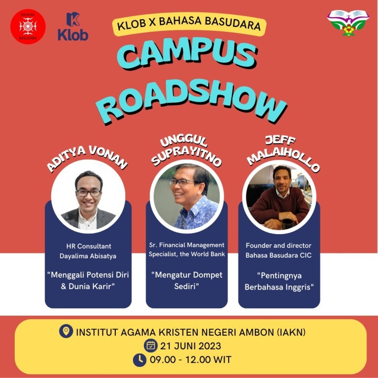Campus Roadshow at Islamic State Institute (IAIN) Ambon, Indonesian Christian University Maluku (UKIM), Christian State Institute (IAKN) Ambon and Pattimura University, talking about reaching self potential and career choices (by KLOB  / Daya Lima), the importance of English in a globalised world (by Bahasa Basudara) and managing one's own finance (by Unggul Suprayitno, a senior financial management specialist at World Bank).